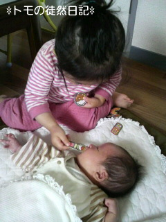 機嫌の悪いあやねをあやしながら新生児のお世話( ´△`)