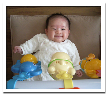 すでにジムのおもちゃを自分の意思で鳴らしている…